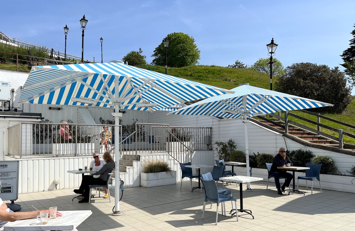 Strong parasols, installed professionally on a large terrace for coffee shops, restaurants, fast food and pubs. These are in an exposed location and offer amazing protection against the elements