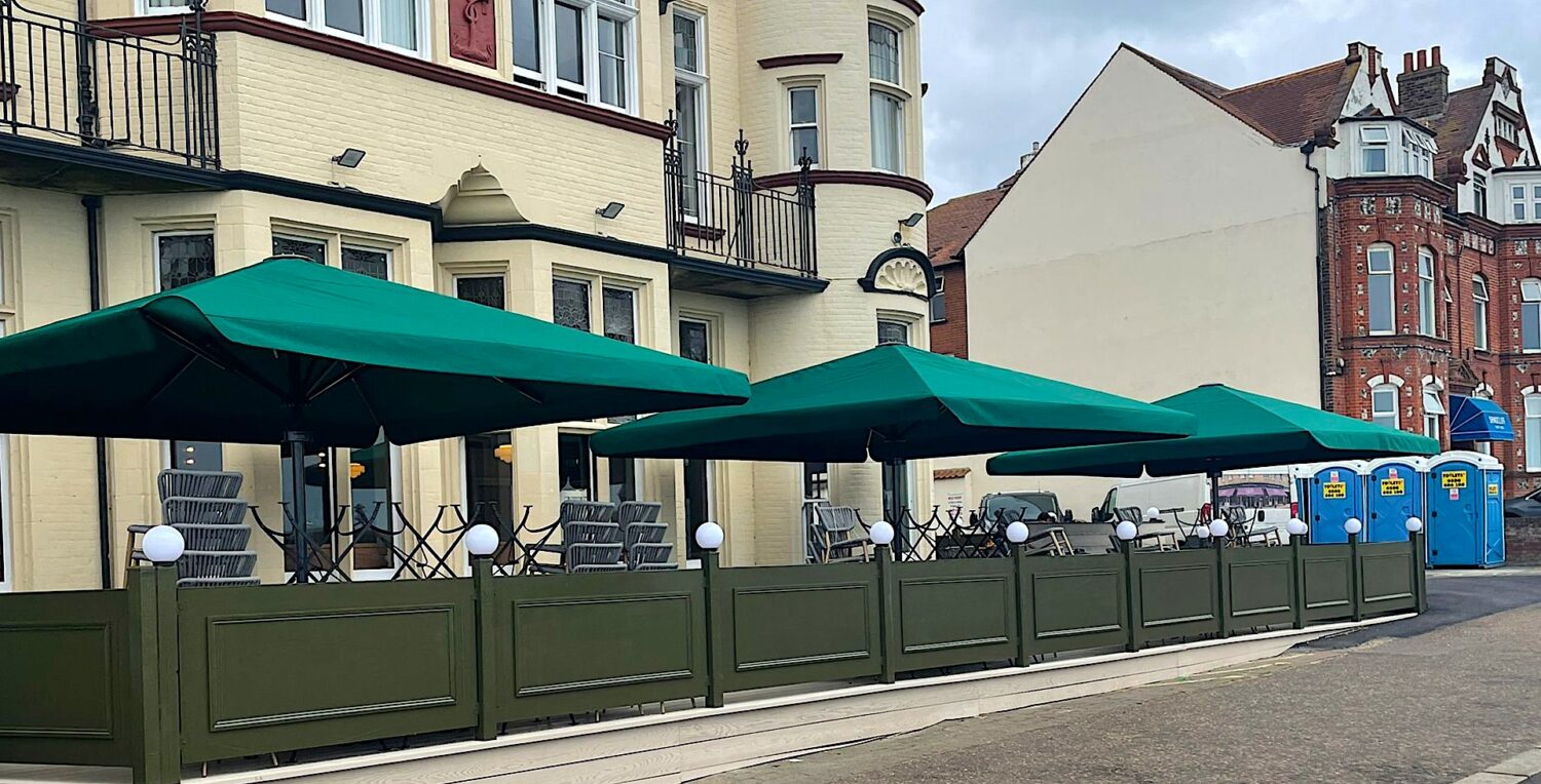 Exposed terrace showcasing UK made Aztec Umbrellas