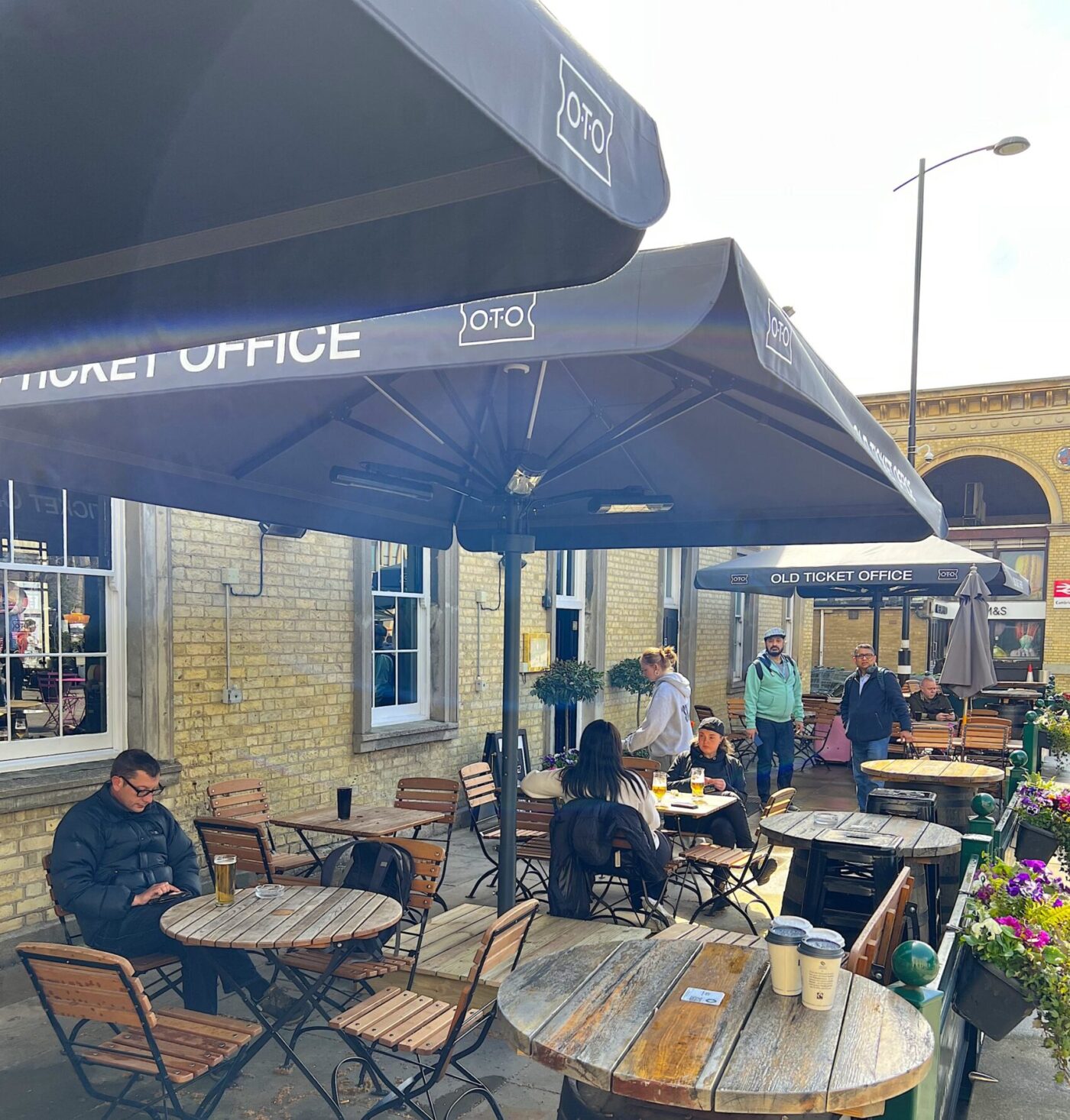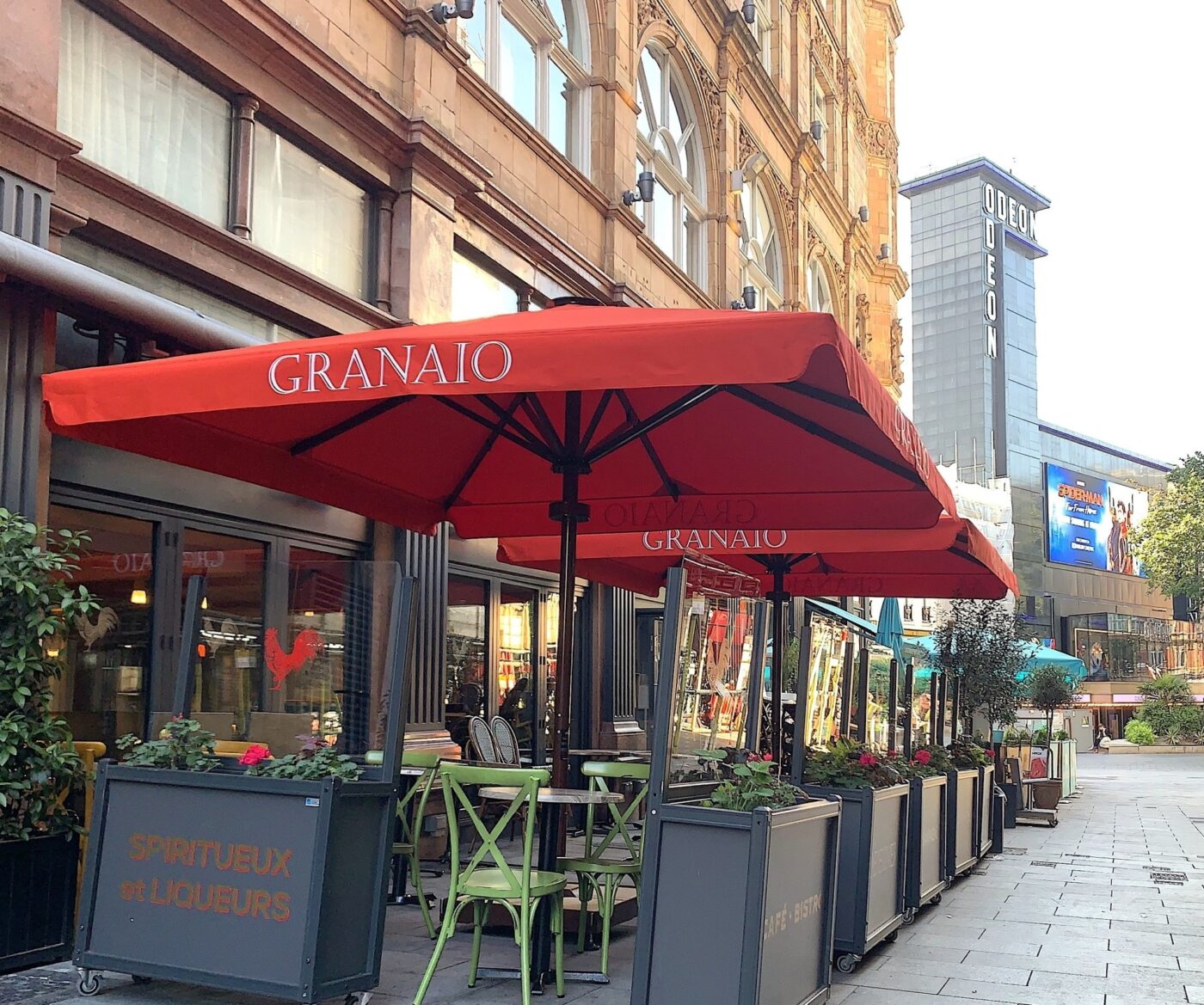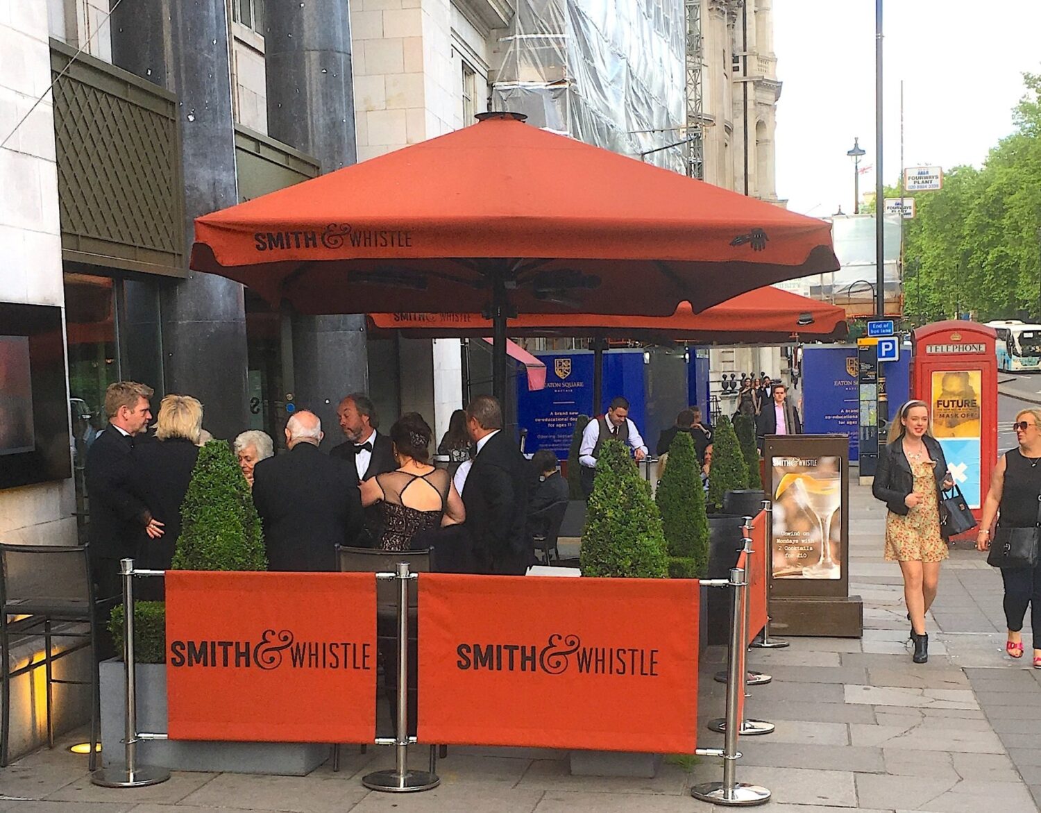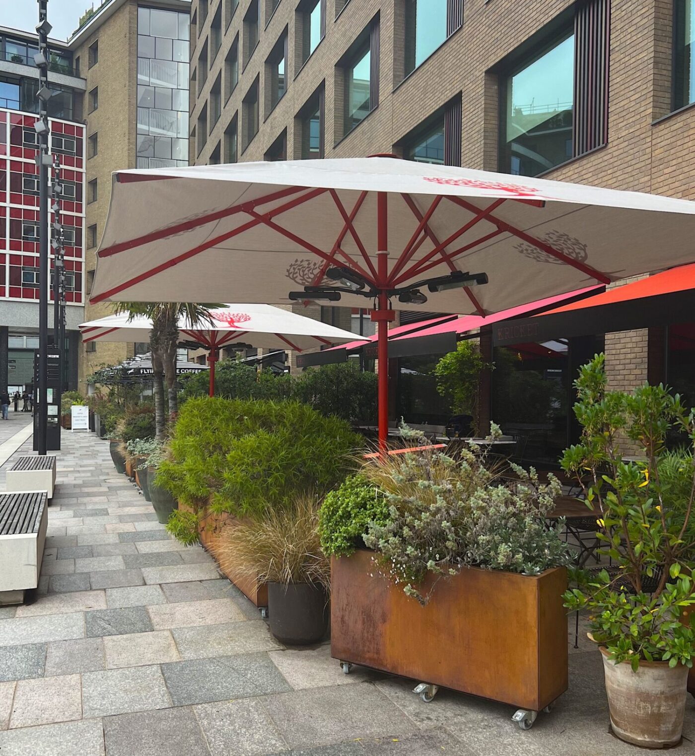 Aztec Luxurious Umbrellas supplied by resellers in London, sheltering customers on side walk customer area.