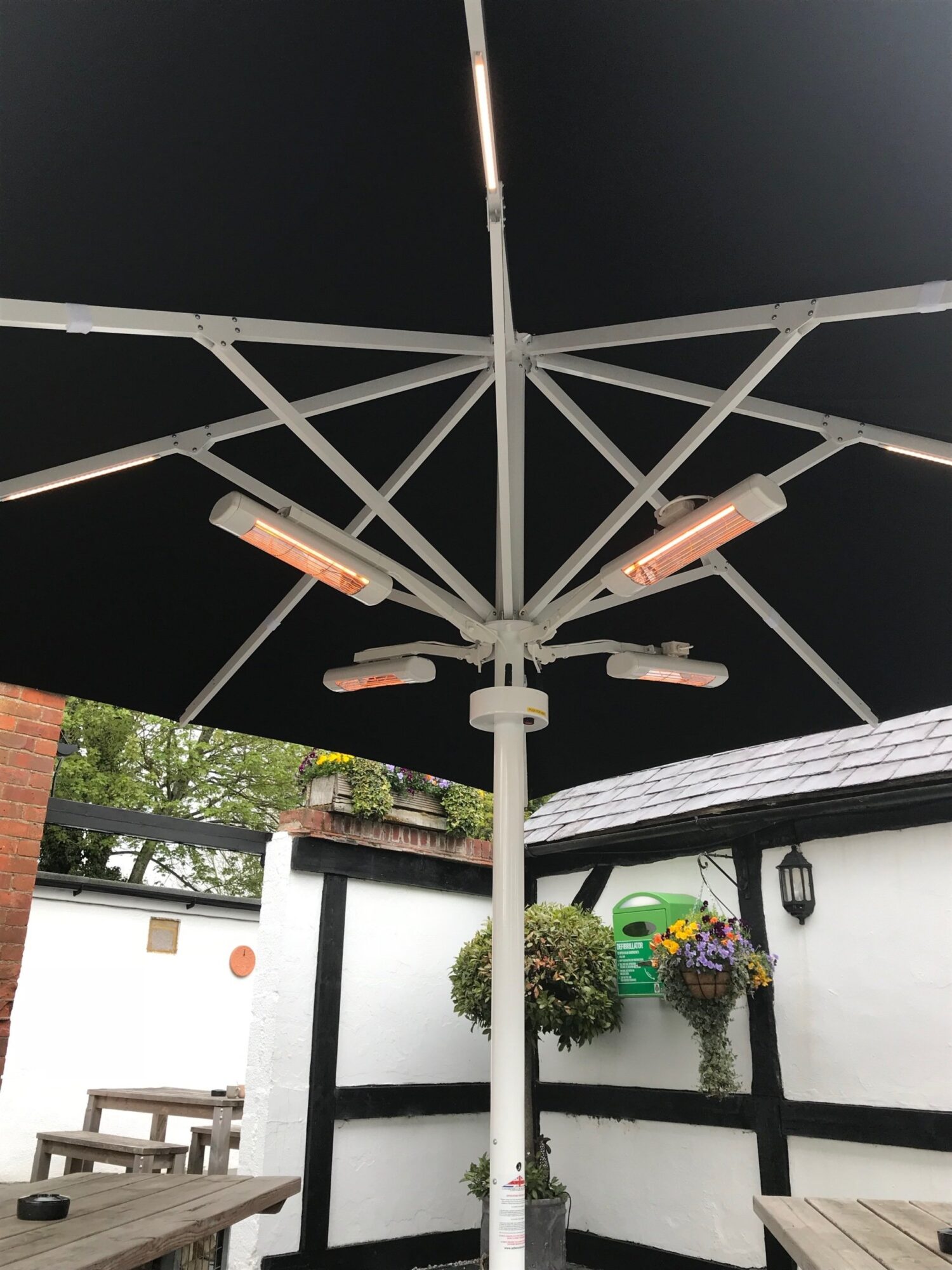 Parasols for restaurants with heat and LED Lights fitted in ground for guests eating alfresco style